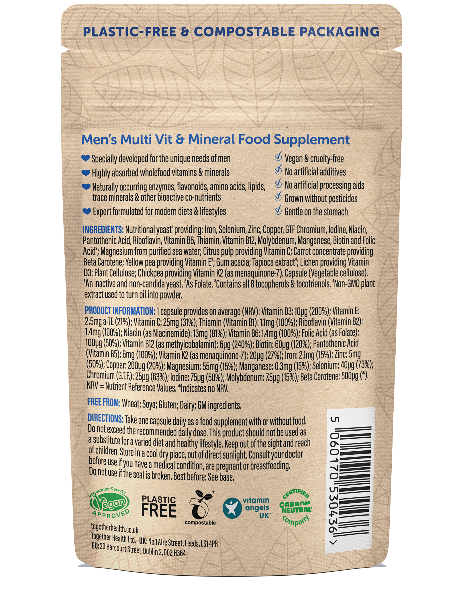 Nutritional yeast¹ providing: Iron, Selenium, Zinc, Copper, GTF Chromium, Iodine, Niacin, Pantothenic Acid, Riboflavin, Vitamin B6, Thiamin, Vitamin B12, Molybdenum, Manganese, Biotin and Folic Acid²; Magnesium from purified sea water; Citrus pulp providing Vitamin C; Carrot concentrate providing Beta Carotene; Yellow pea providing Vitamin E³; Gum acacia; Tapioca extract⁴; Lichen providing Vitamin D3; Plant Cellulose; Chickpea providing Vitamin K2 (as menaquinone-7). Capsule (Vegetable cellulose). ¹An inactive and non-candida yeast. ²As Folate.³Contains all 8 tocopherols & tocotrienols. ⁴Non-GMO plant extract used to turn oil into powder.